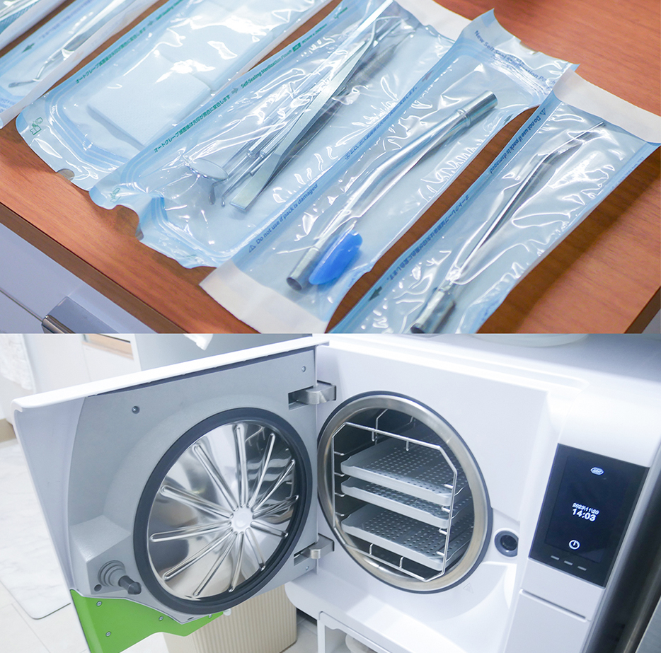 治療器具は、すべて使い回しを廃止しました。すべての器具は洗浄したあとに、消毒薬を浸した超音波洗浄機で徹底消毒し、用途別に滅菌パックに入れた状態で高水準滅菌器や専用滅菌器を使い分けて厳密に滅菌処理をしております。